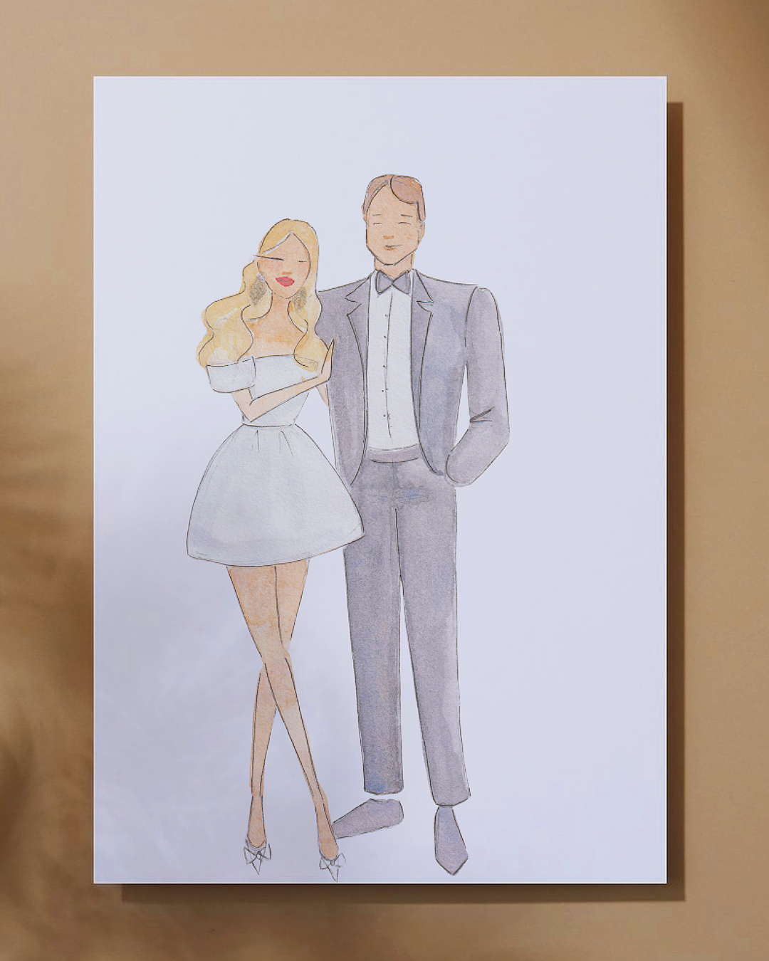 Watercolor illustration of a smiling woman in an orange dress and a man in a light suit standing close together.