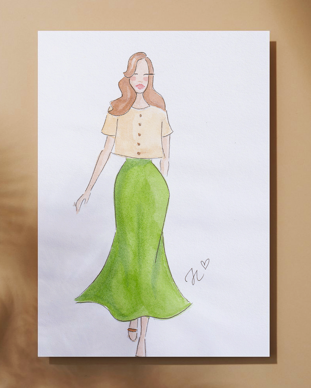 Watercolor fashion illustration of a woman in a pink dress with a high slit, wearing strappy sandals and gold bangles, signed with initials and a heart.